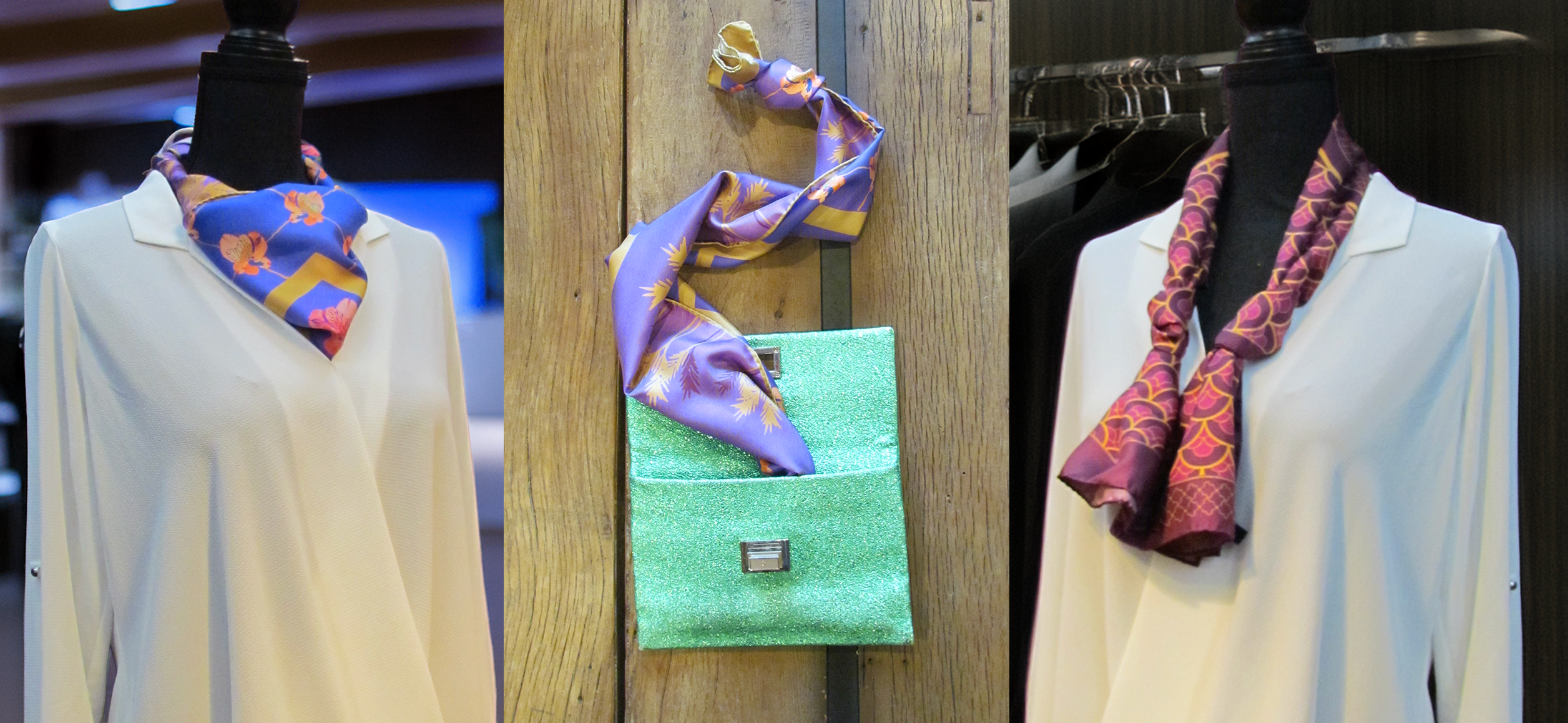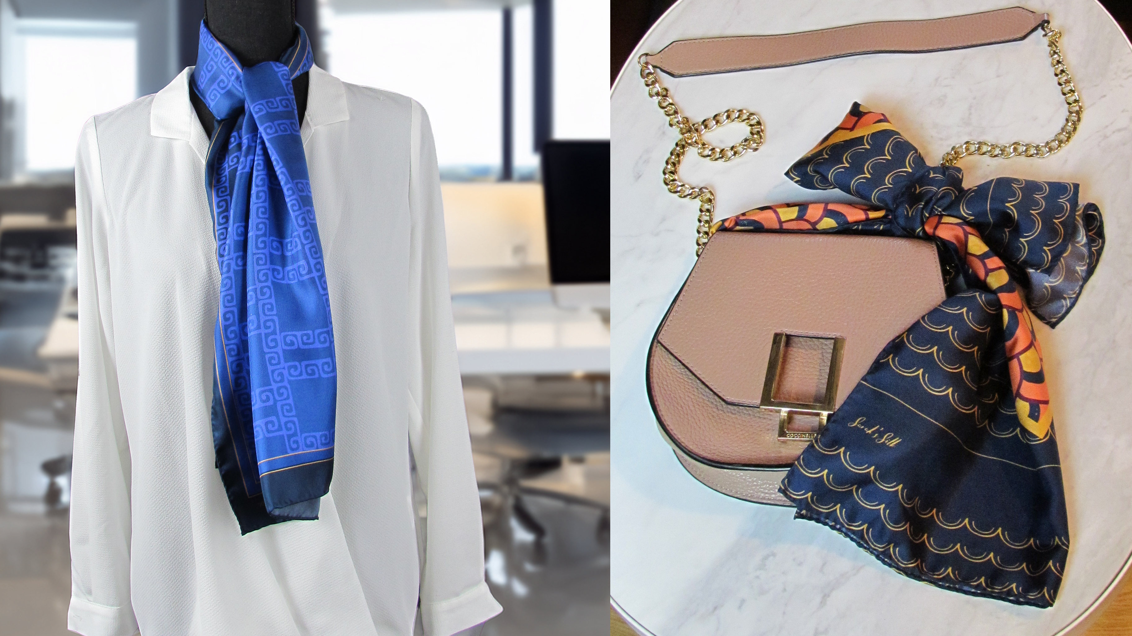 100% pure silk pieces, each one designed from Sarah’s own hand-drawn patterns and a whole lot of passion. From the bold ornamental shapes in deep reds and golds of the Deco Luxe Collection, to the playful peach-and-blue mermaid scales trimmed with golden waves in the Mermaid Collection, every design has its own personality.